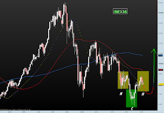 Nuestro IBEX había dibujado un HCH invertido, muy bien definido, con zona de escape, pero parece que retrocede sobre sus pasos, y la situación se complicara si termina perforando la linea clavicular que he dibujado.